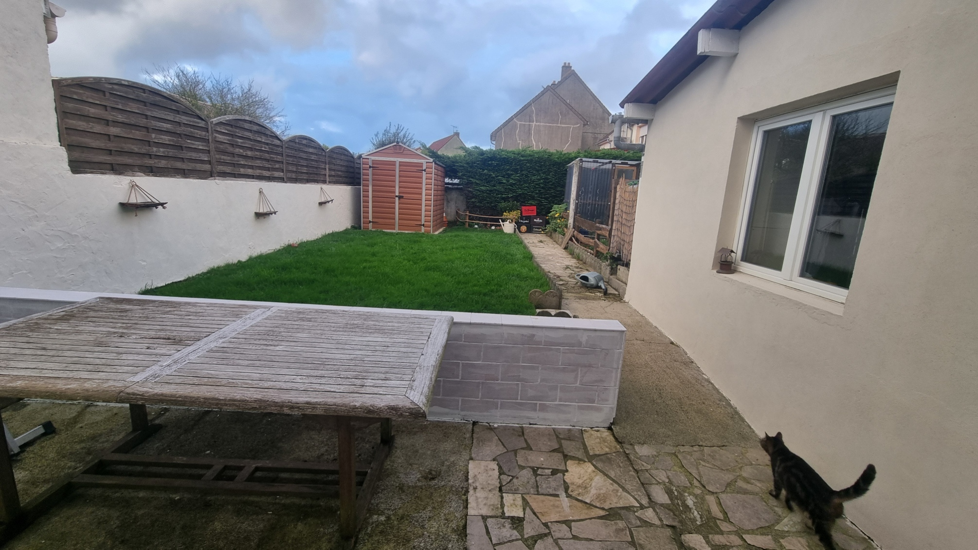 Cour/terrasse à l'abri des regards, pelouse et espace potager - Stationnement possible pour 2 véhicules dans la cour devant la maison.