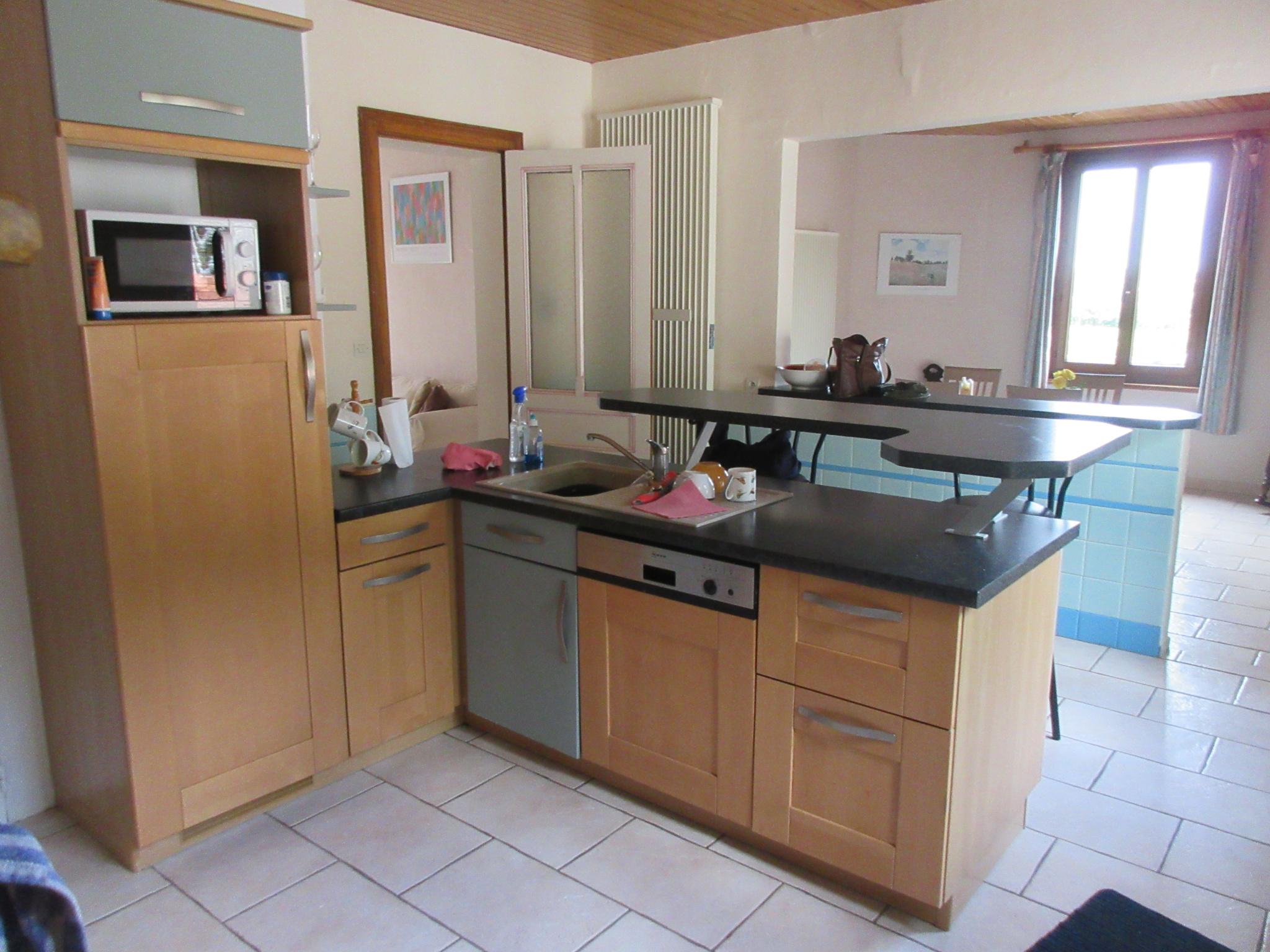 Maison principale: cuisine aménagée équipée ouverte sur séjour, double salon avec cheminées feu de bois, cellier/laverie, salle d'eau, WC, petite chambre et bureau ;